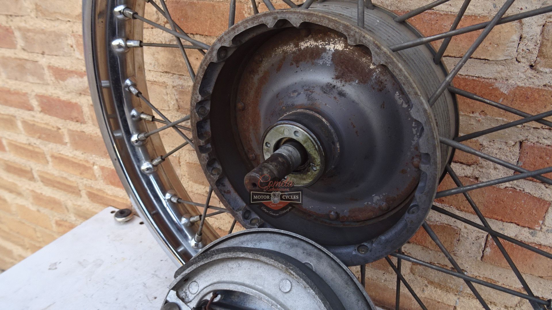 BUJE DELANTERO CON PLATO PORTAZAPATAS Y LLANTA BSA ARIEL NORTON TRIUMPH AÑOS 20