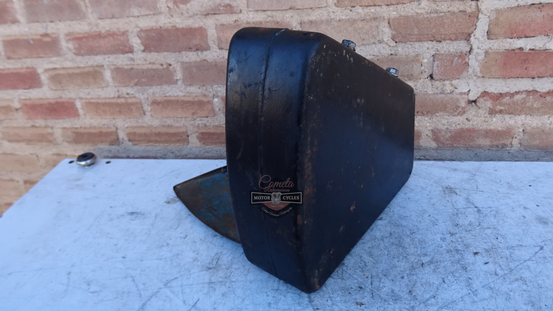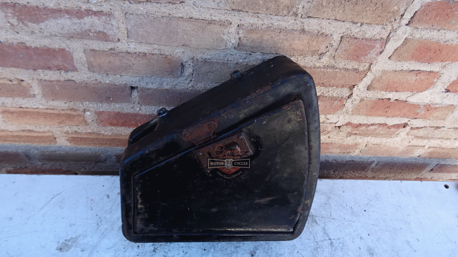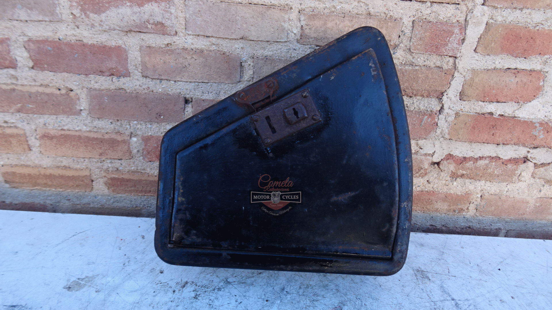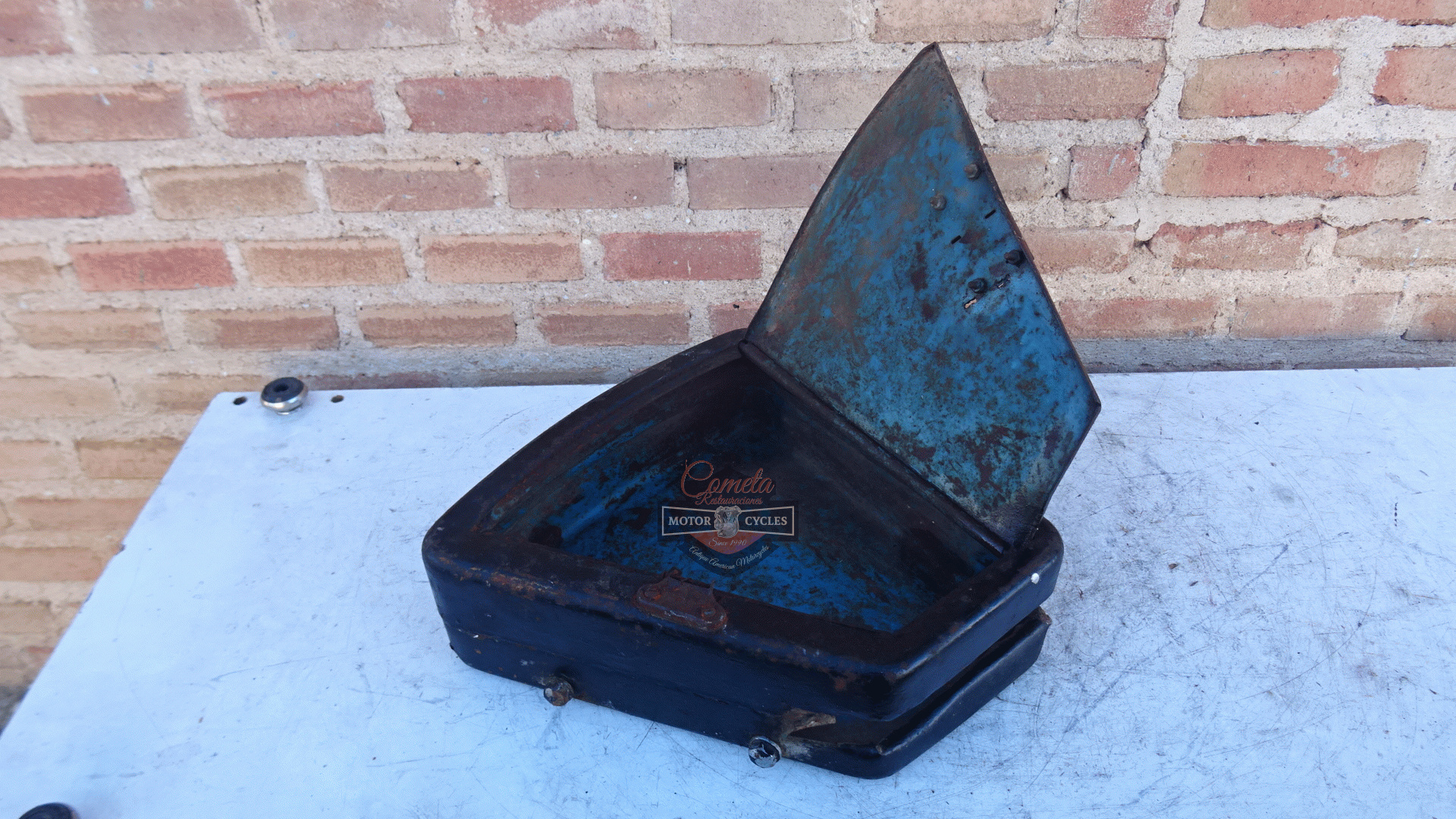 caja de herramientas original Norton 18 / 16h tiene que repararse uno de los lados por que la cortaron para adaptarla a un bastidor con suspension plunger , años 1931 a 1939