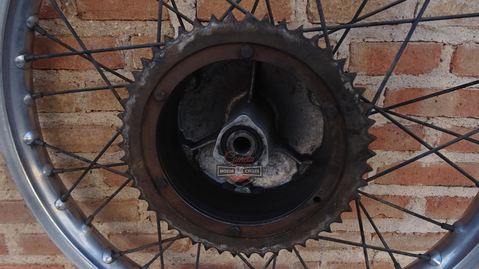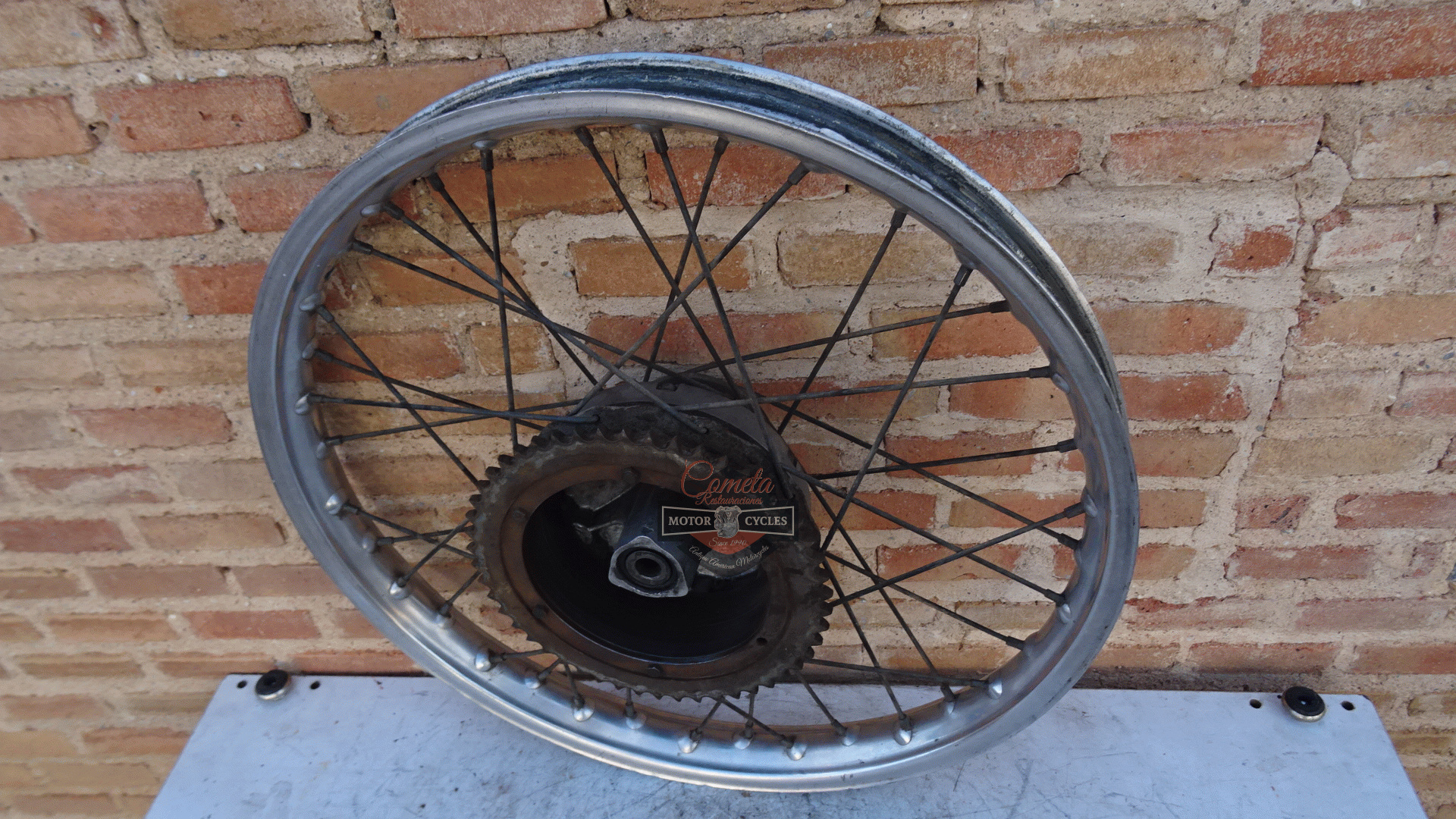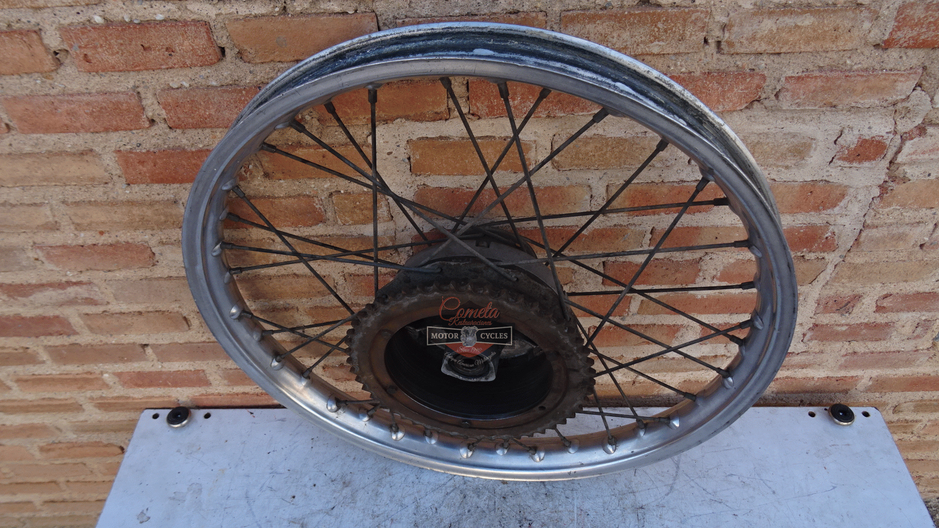 rueda / buje trasero con llanta de aluminio original para BULTACO TRALLA 101 / BULTACO TSS 125cc años 1959 A 1963 Rear wheel/hub with original aluminum rim for BULTACO TRALLA 101 / BULTACO TSS 125cc, years 1959 to 1963.