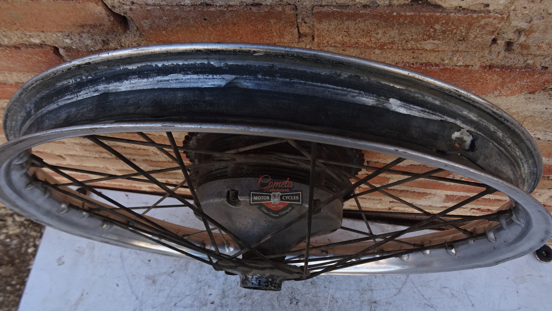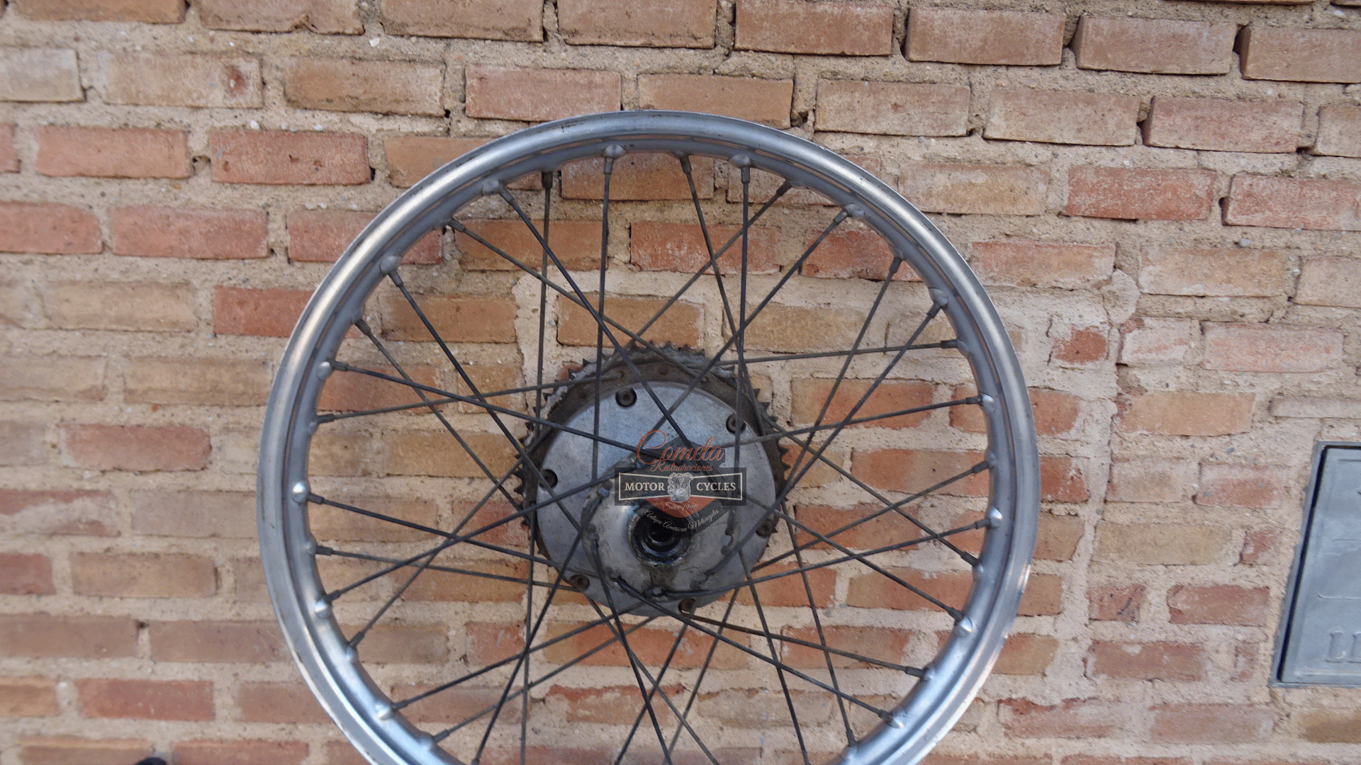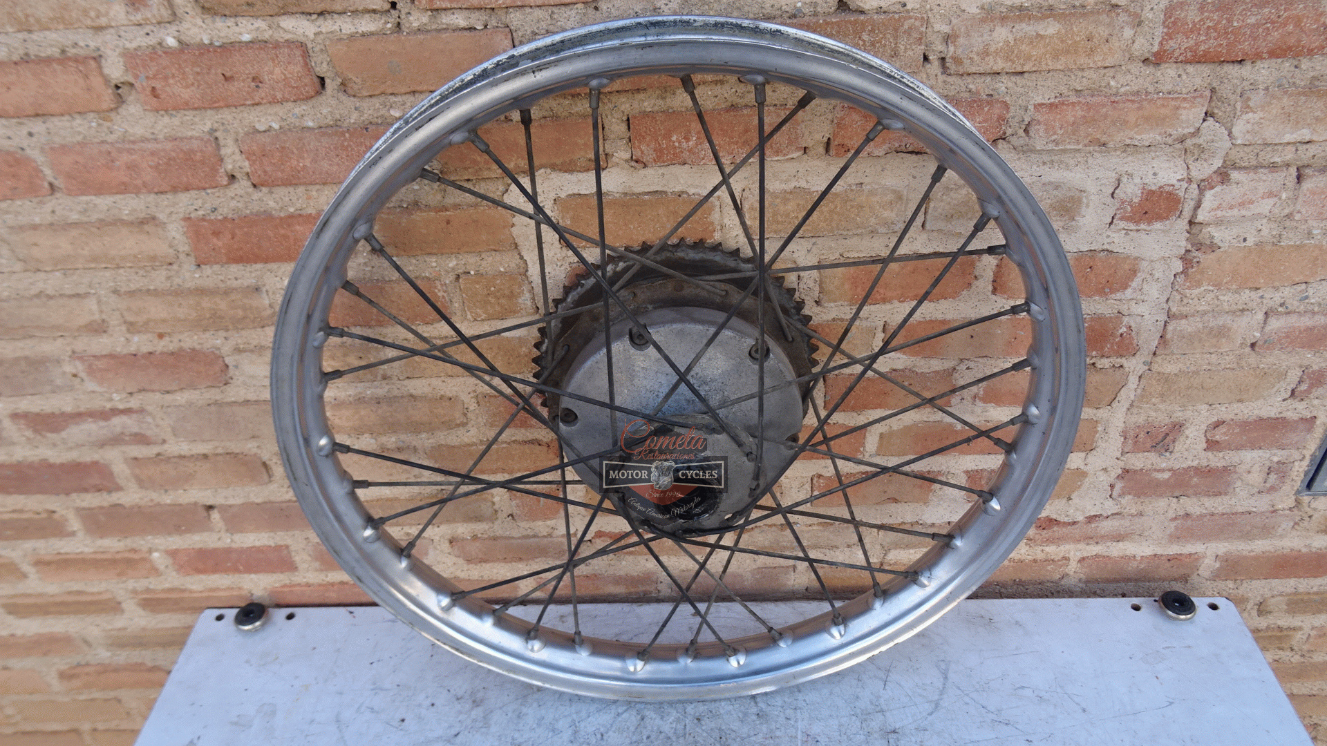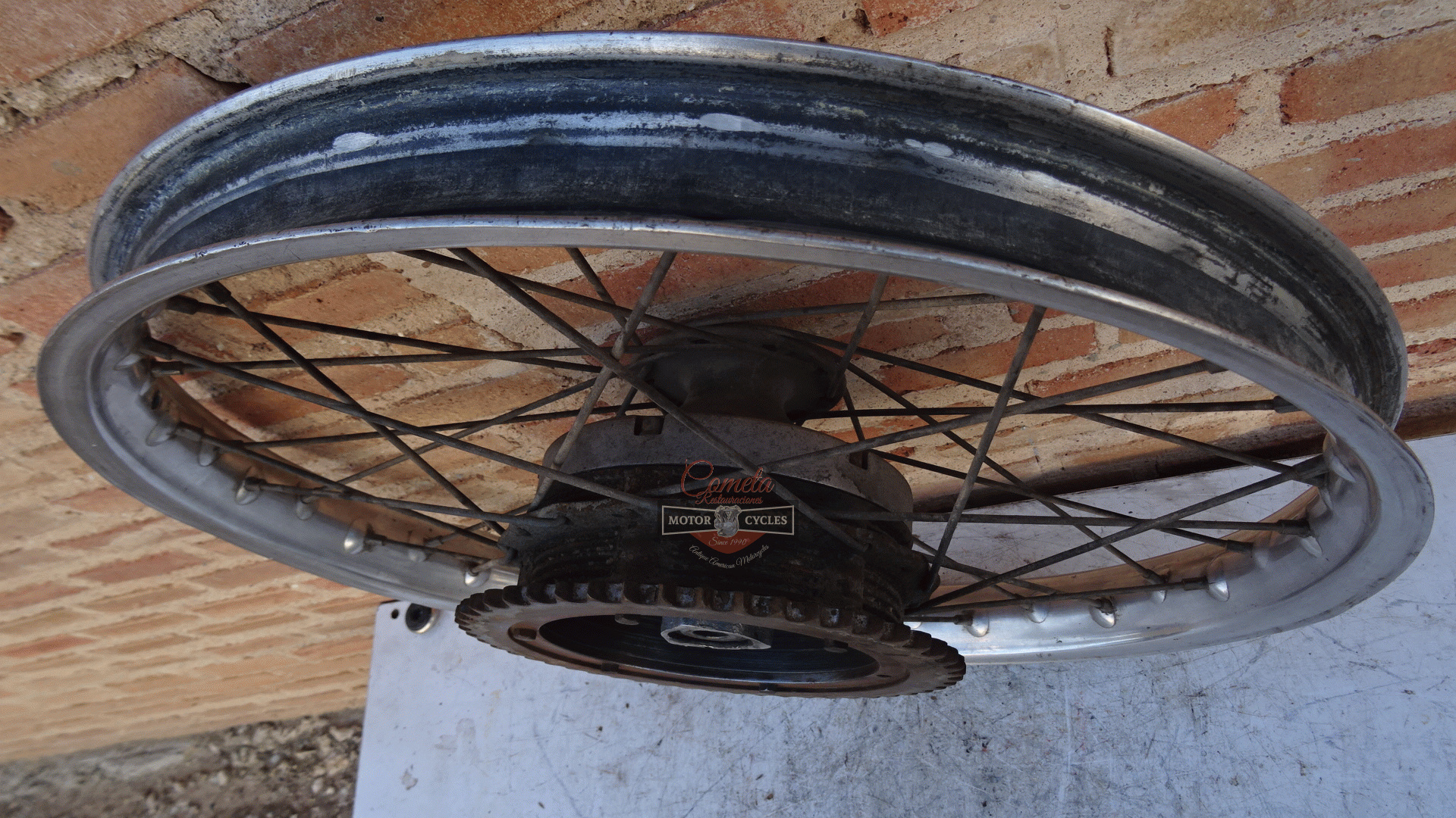 rueda / buje trasero con llanta de aluminio original para BULTACO TRALLA 101 / BULTACO TSS 125cc años 1959 A 1963 Rear wheel/hub with original aluminum rim for BULTACO TRALLA 101 / BULTACO TSS 125cc, years 1959 to 1963.