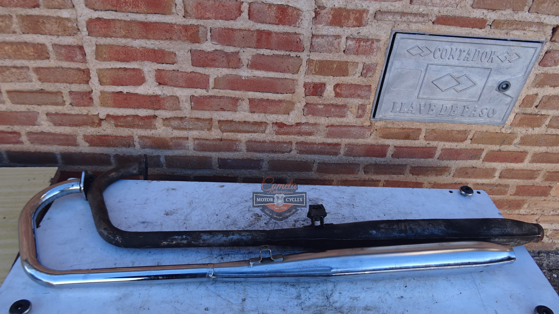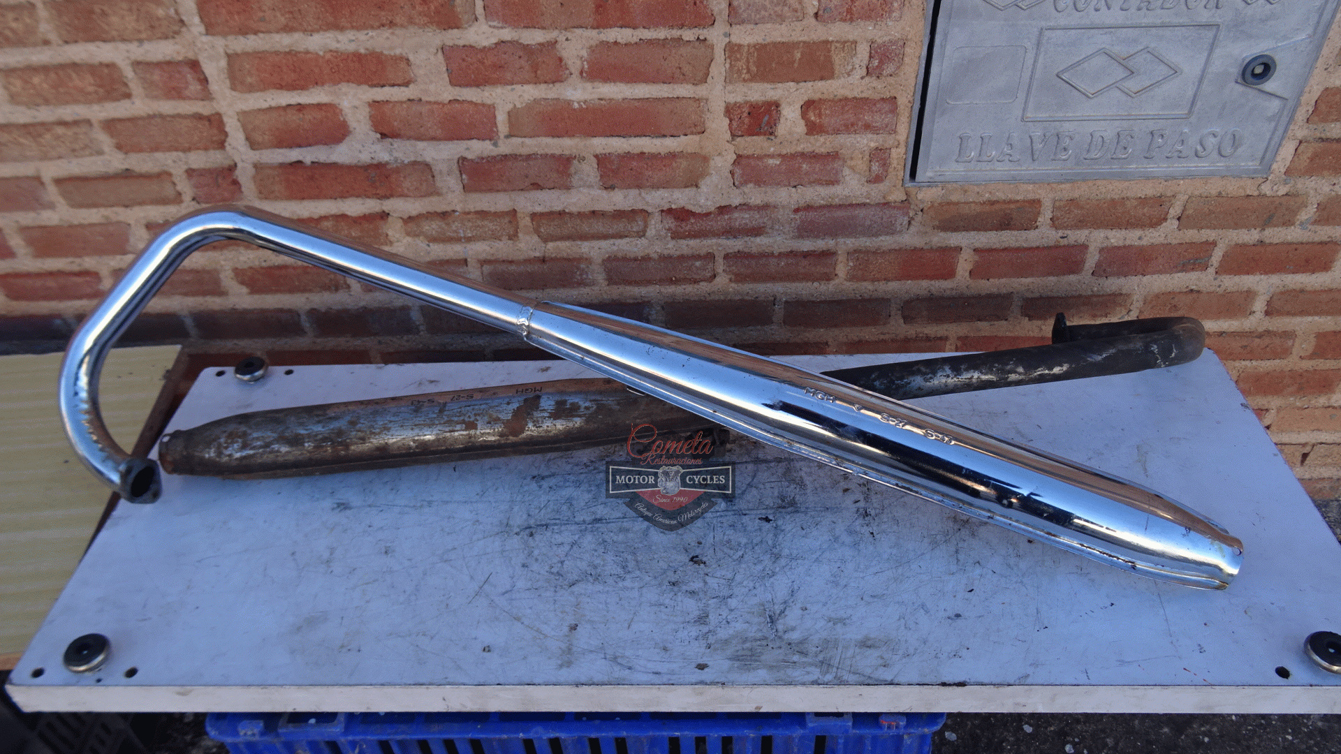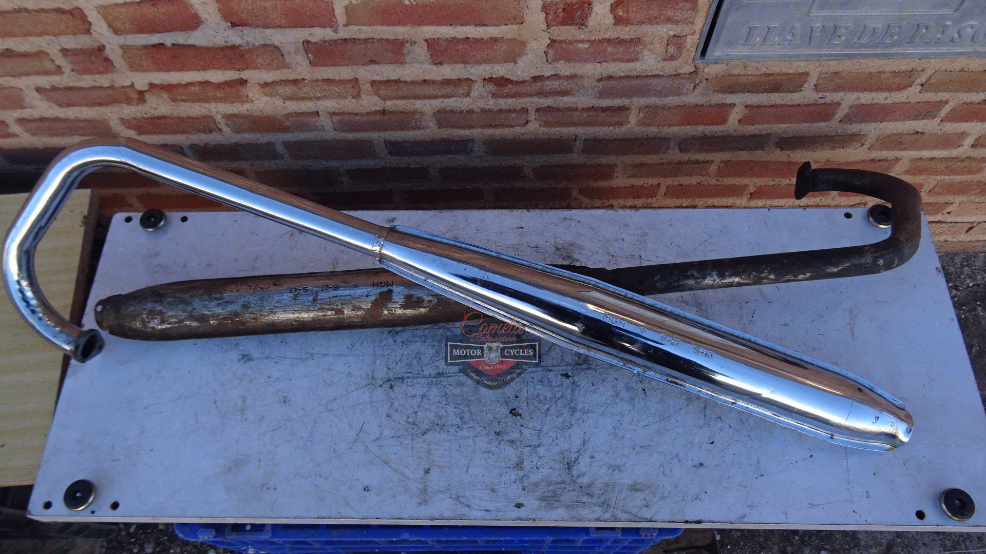 Complete exhaust systems, one new old stock chrome-plated and one used for restoration, for MOTO GUZZI HISPANIA model CANGURITO 50cc. Price of the new one: 150 euros. Price of the used one: 80 euros. Years: 1968 to 1973.