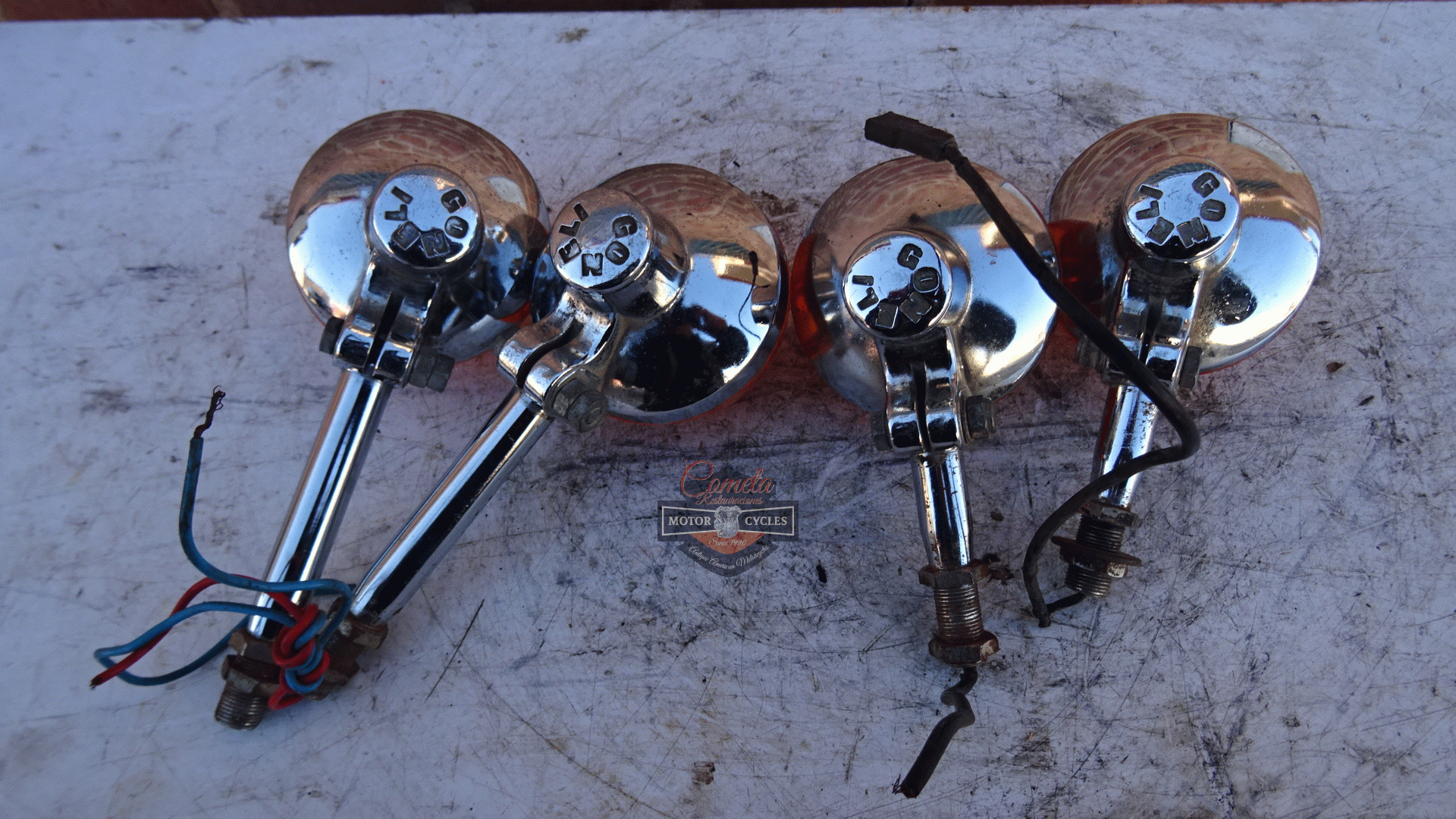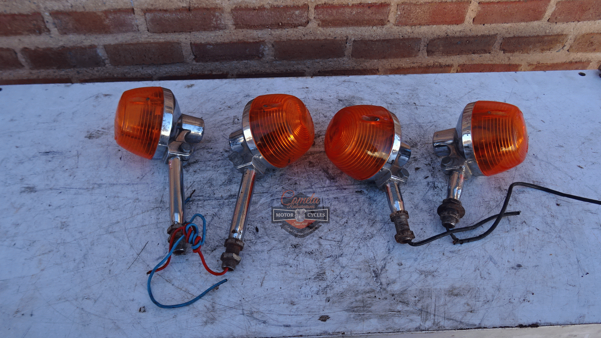 Original ambar indicator lights with chrome brackets, brand GONELI model 450 , made in SPAIN , for motorcycles from the 1970s to the 1980s.