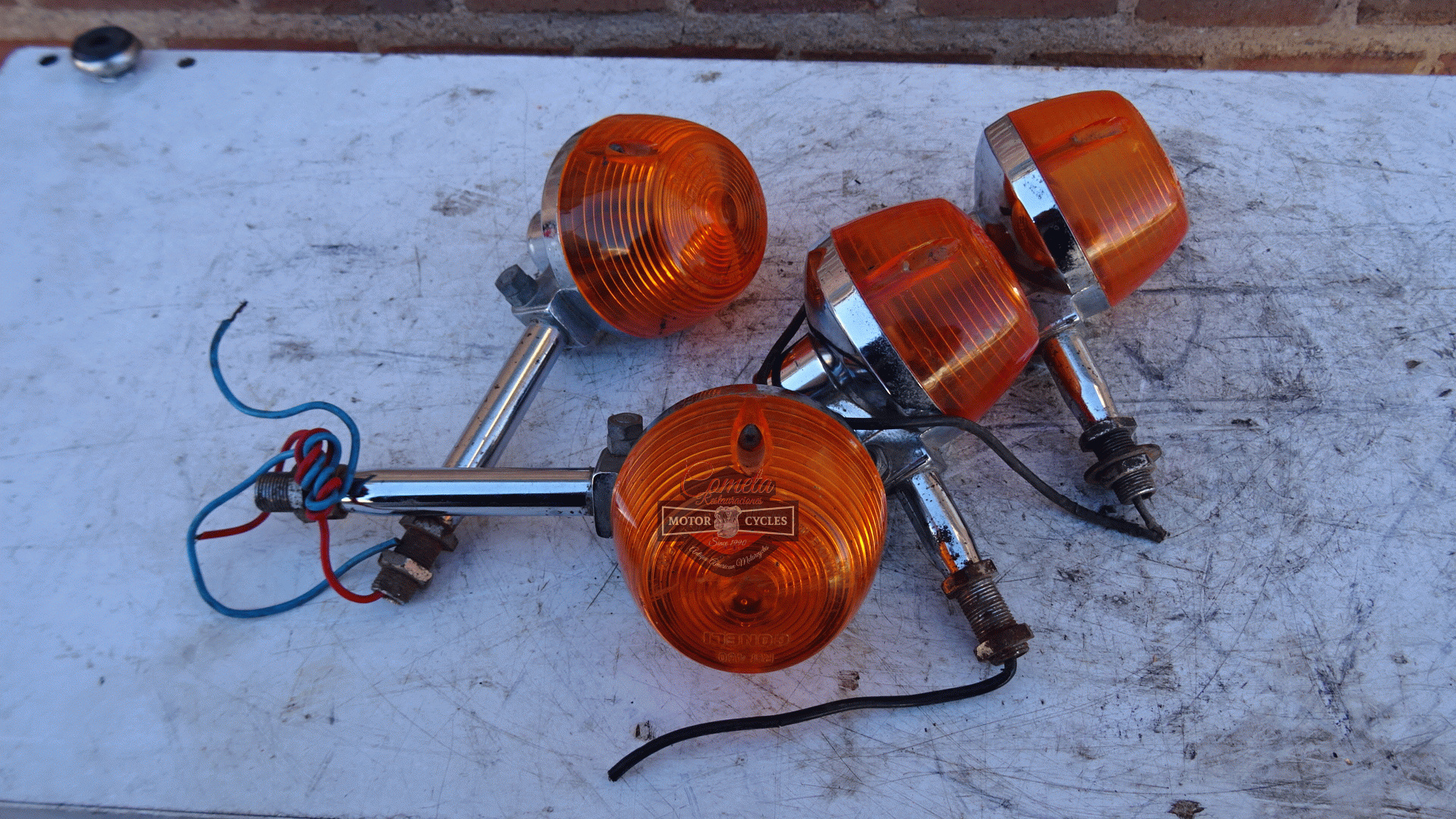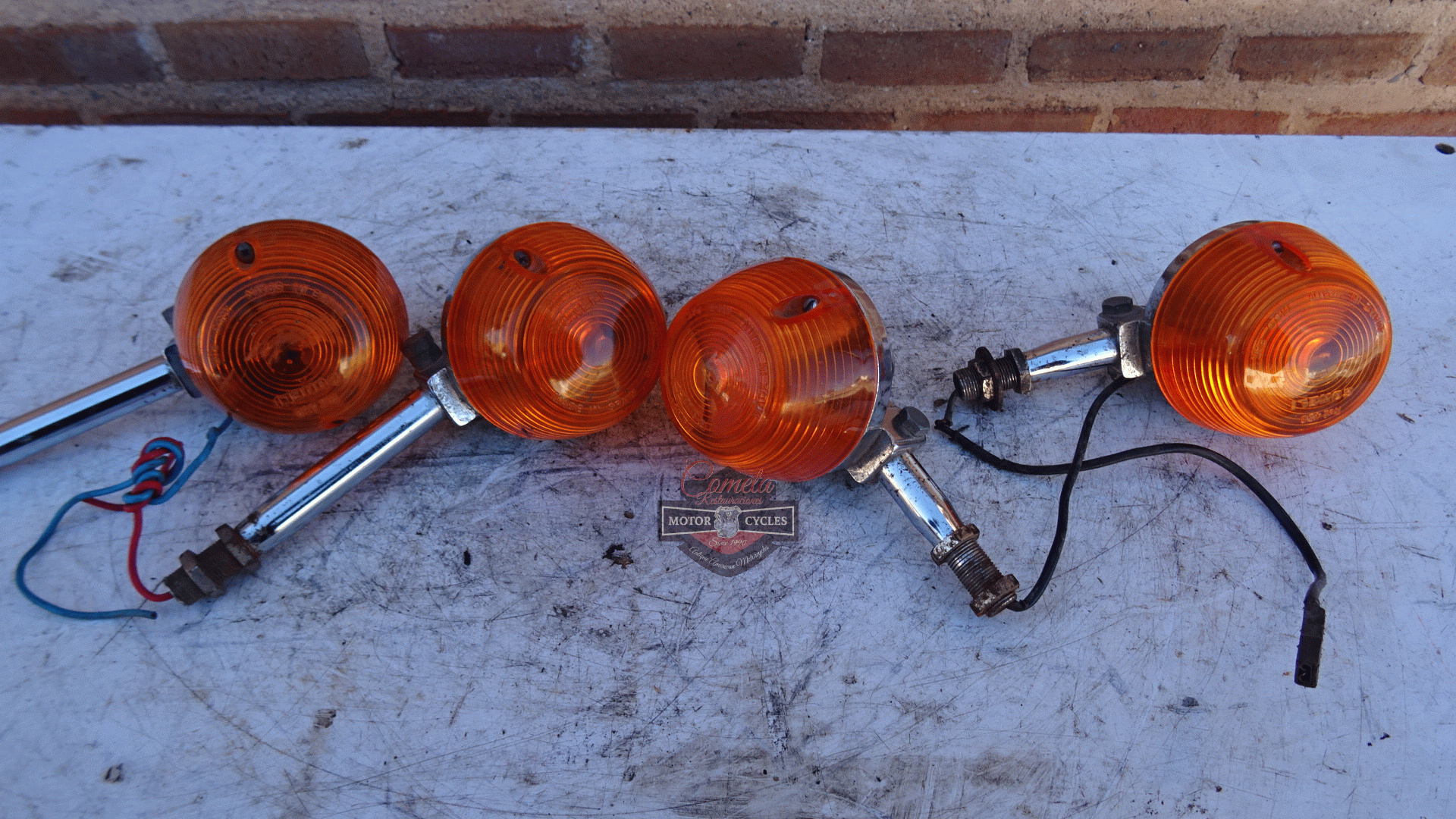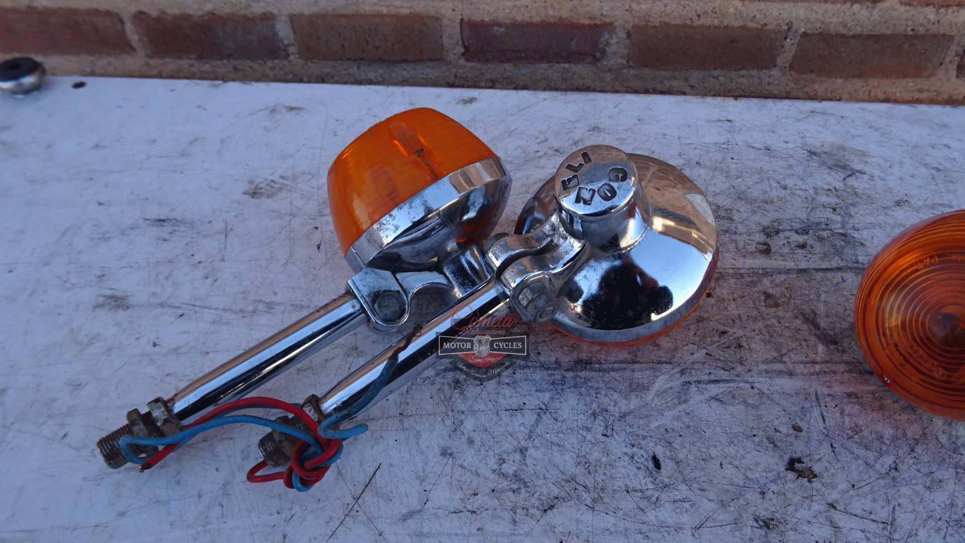pilotos de intermitencia / intermitentes originales ambar con soportes cromados marca GONELI modelo 450 made in SPAIN para motocicletas años
