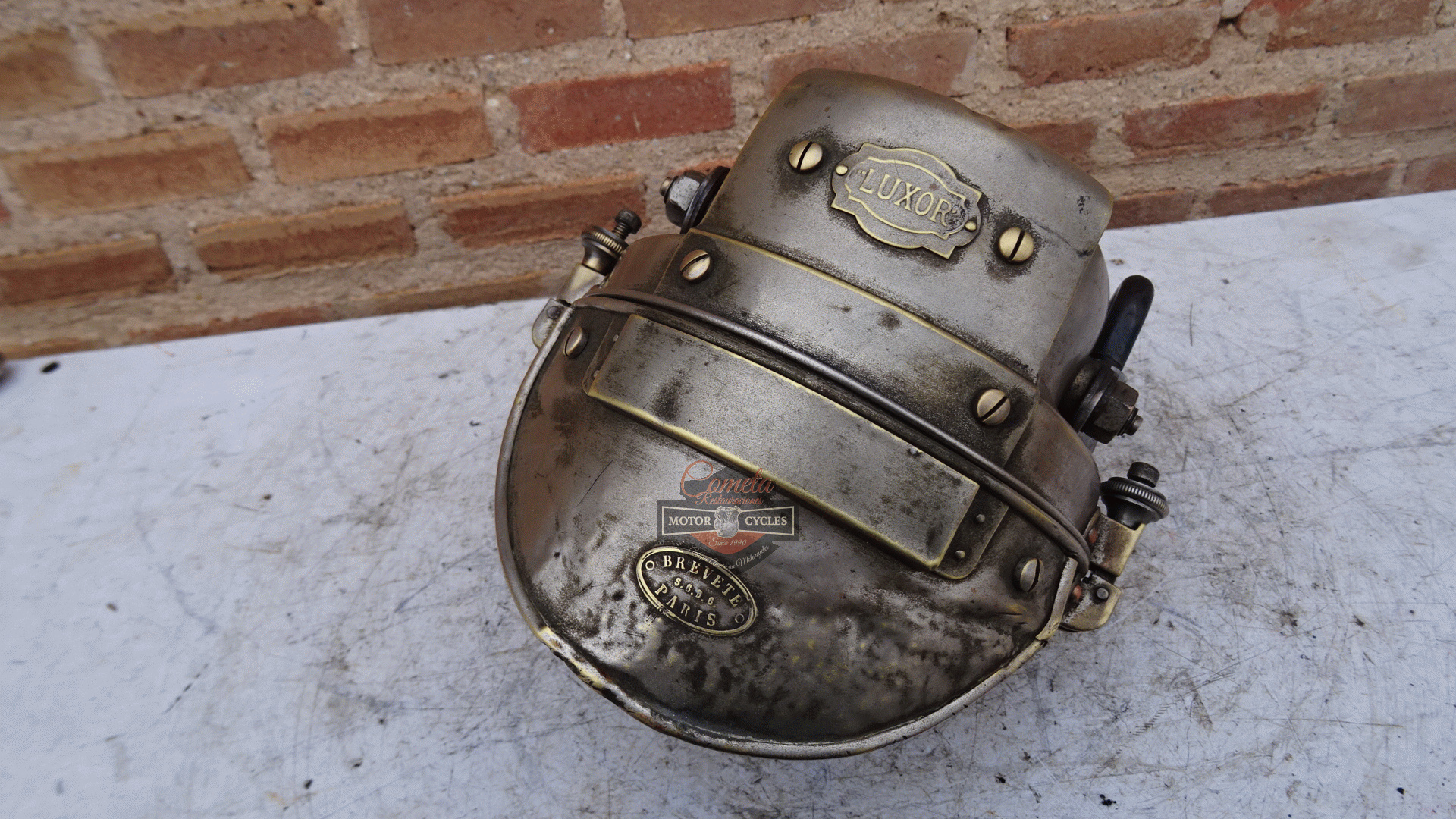 LUXOR brand carbide/acetylene headlight with brackets, in good condition, for French motorcycles from 1910 to 1925.