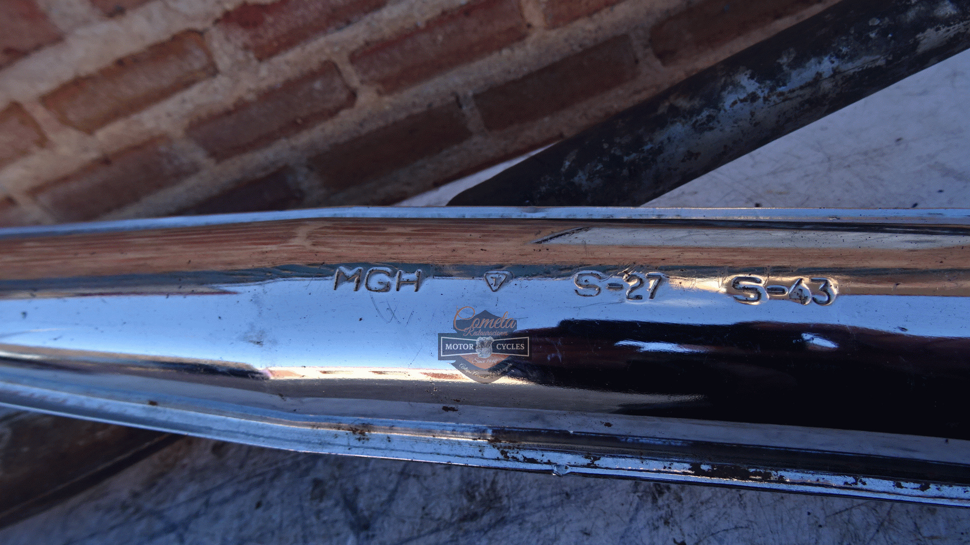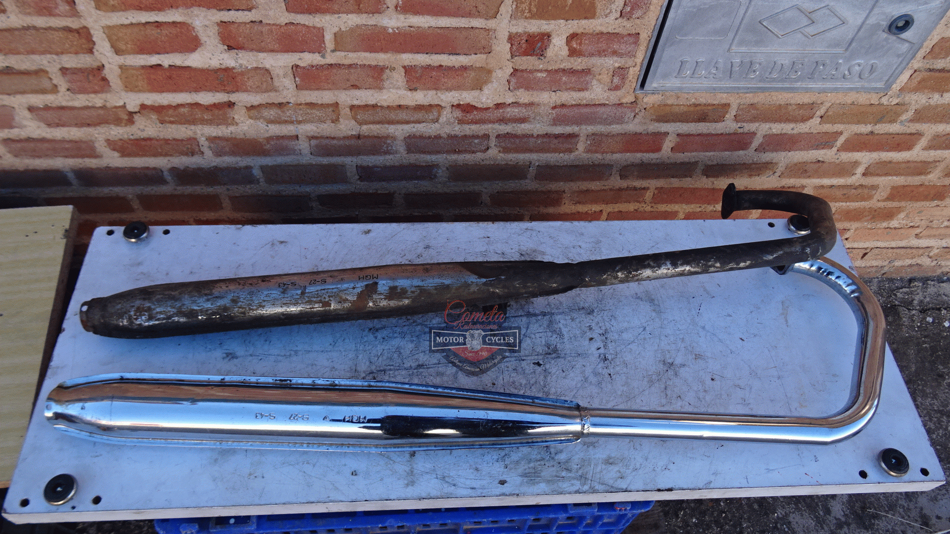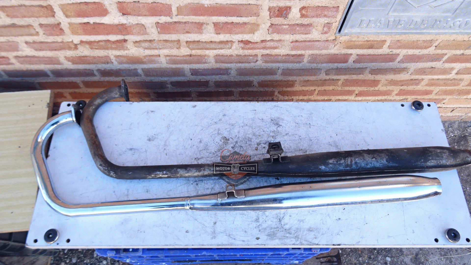 Complete exhaust systems, one new old stock chrome-plated and one used for restoration, for MOTO GUZZI HISPANIA model CANGURITO 50cc. Price of the new one: 150 euros. Price of the used one: 80 euros. Years: 1968 to 1973.